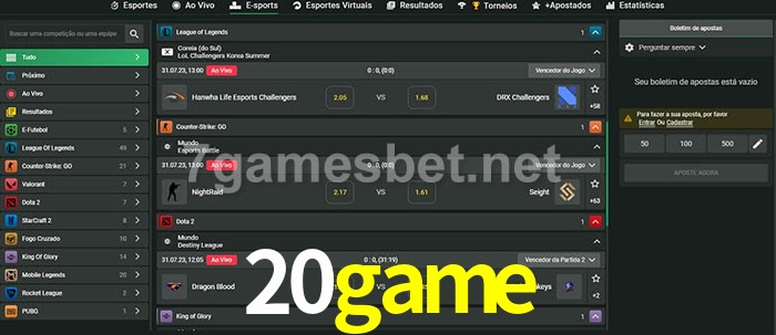 O 20game oferece uma grande seleção de opções de apostas em e-sports com probabilidades competitivas